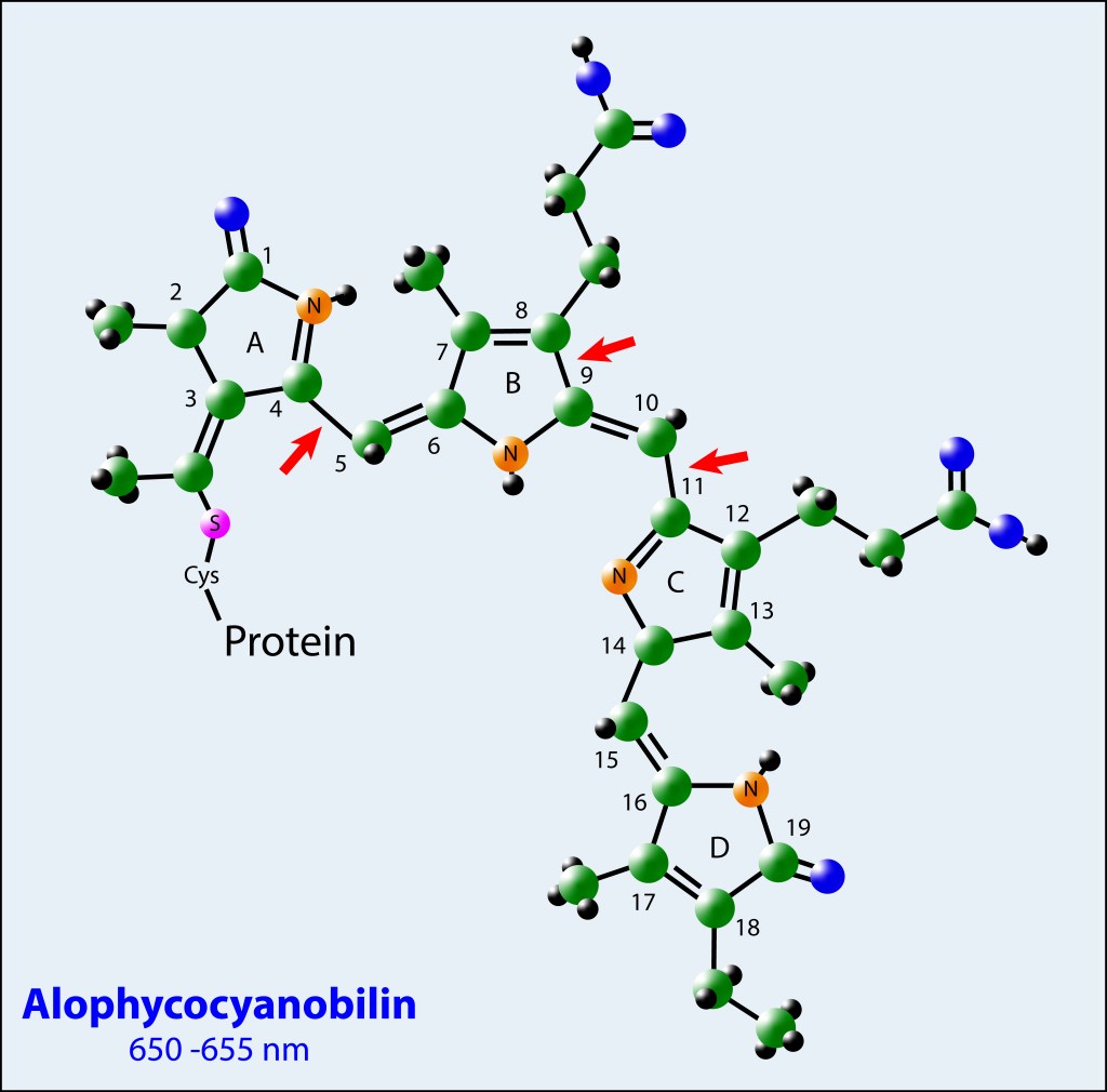 Los pigmentos fotosintéticos obedecen a una estructura tetrapirrólica de anillo abierto, con diferencias en el radical asociado al carbono 18 (Vinil para Phycoerytrobilina, Ethil para Phicocyanobilina y Alophycocyanobilina), y con diferencias en las posiciones de algunos enlaces Pi conjugados entre Phycocyanobilina y Alophycocyanobilina , ver Fig.4.