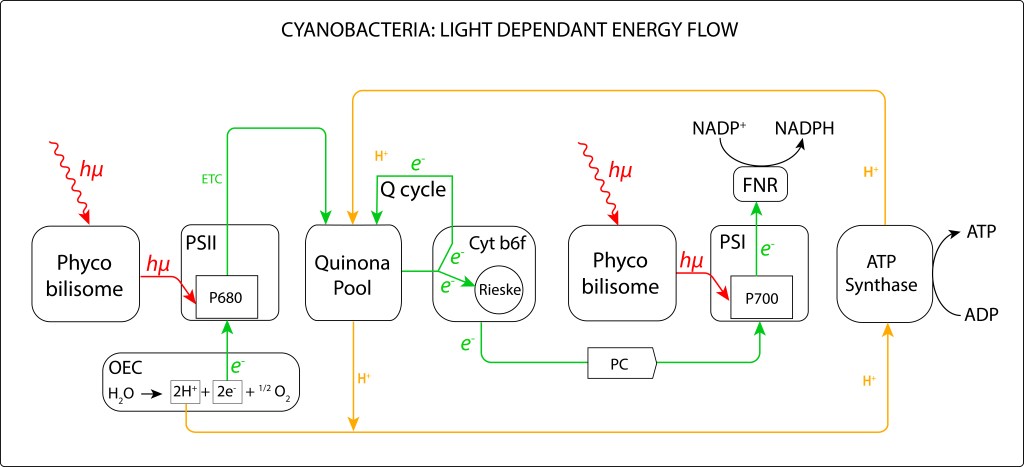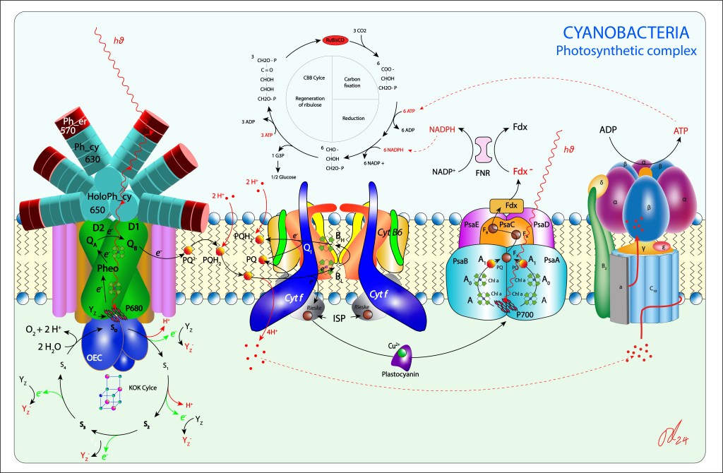 Durante el proceso de la fotosíntesis, la energía lumínica es capturada por complejos antena denominados Phycobilisomas (PBS). La energía es luego transmitida hacia los centros de reacción (RC), donde pares especiales de clorofilas Chla son exitados a niveles energéticos que permiten la liberación electrónica en Chla para iniciar la cadena de transporte de electrones (ETC) , motor final de las maquinarias fotosintéticas.