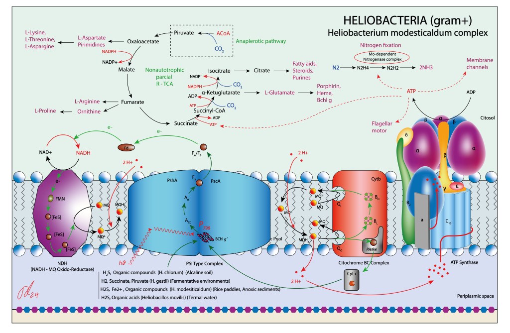 Al igual que en GSB, los Ciclos CBB y Biciclo 3-HP están ausentes. En general las rutas bioquímicas del carbono aparecen muy simplificadas en Heliobacterias. En contraste, las rutas fijadoras de nitrógeno (Mo dependientes) son muy robustas. En este sentido podrían desempeñar en gramineas un soporte nitrificante similar al de Rhizobium, Bradyrhizobium y Sinorhizobium en leguminosas, si bién nunca conformando nódulos radiculares.