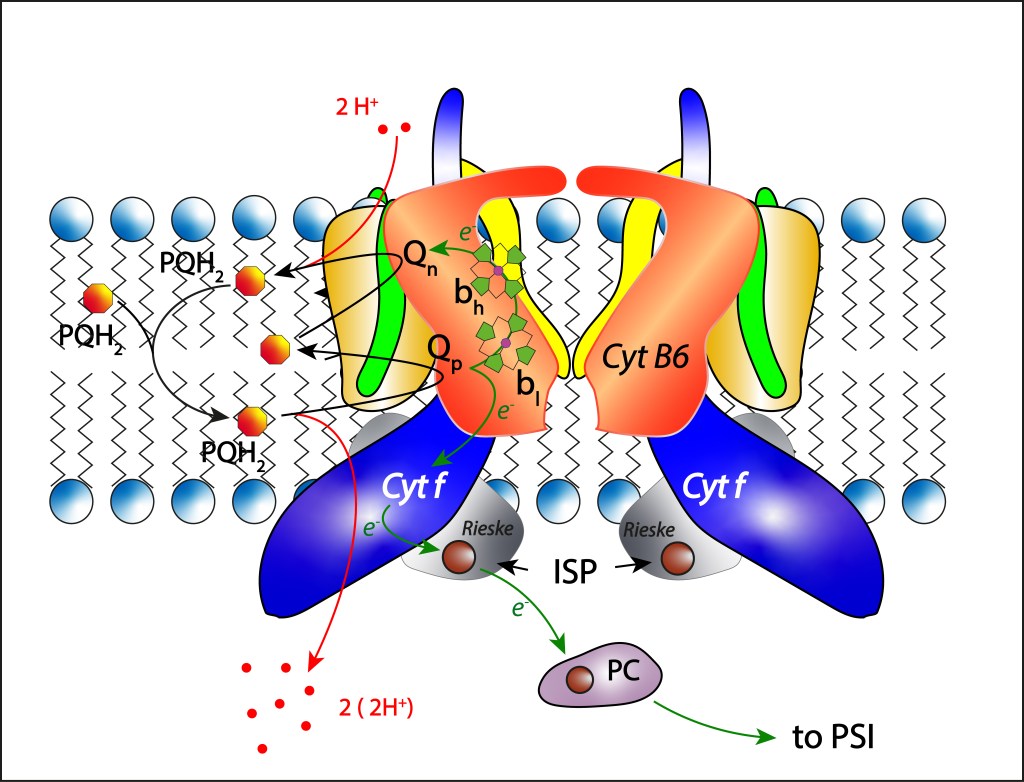 El complejo Cyt b6f es un complejo proteínico transmembrana con moléculas Heme como cofactores, ver Fig 10. Sus funciones consisten en transferir electrones al fotosistema PSI orientados a síntesis de NADPH y mover protones del citoplasma al lumen thylakoide mediante una secuencia de oxidaciones y reducciones de quinonas aprovechando una cadena de transporte de electrones ETC habilitada por cambios reversibles entre los estados de oxidación Fe³⁺ / Fe²⁺ de átomos de hierro presentes en moléculas Heme al interior del complejo.