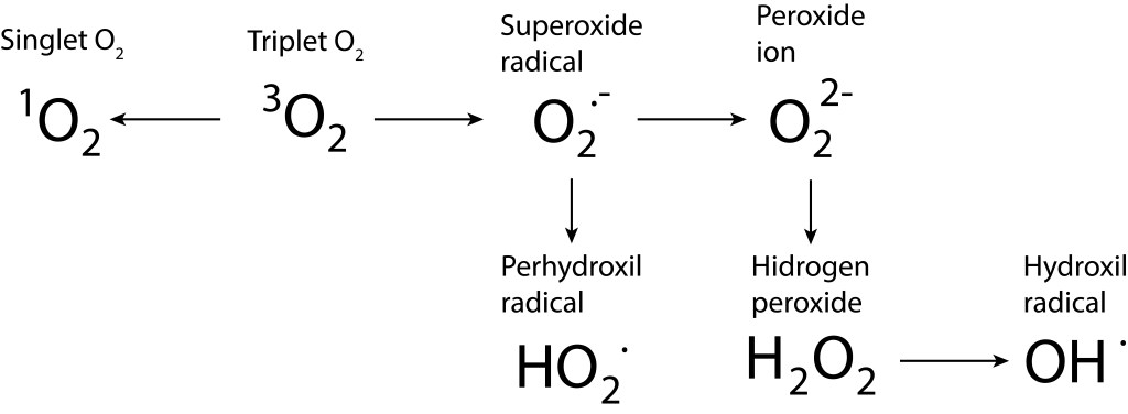 Bajo estas condiciónes, la probabilidad de generarse especies reactivas de oxígeno ROS, es muy alta, exponiendo a PSI y PSII a daños severos. La síntesis de especies reactivas del oxígeno y los orbitales moleculares correspondientes a las mismas se resumen en las Fig 1 y Fig 2.