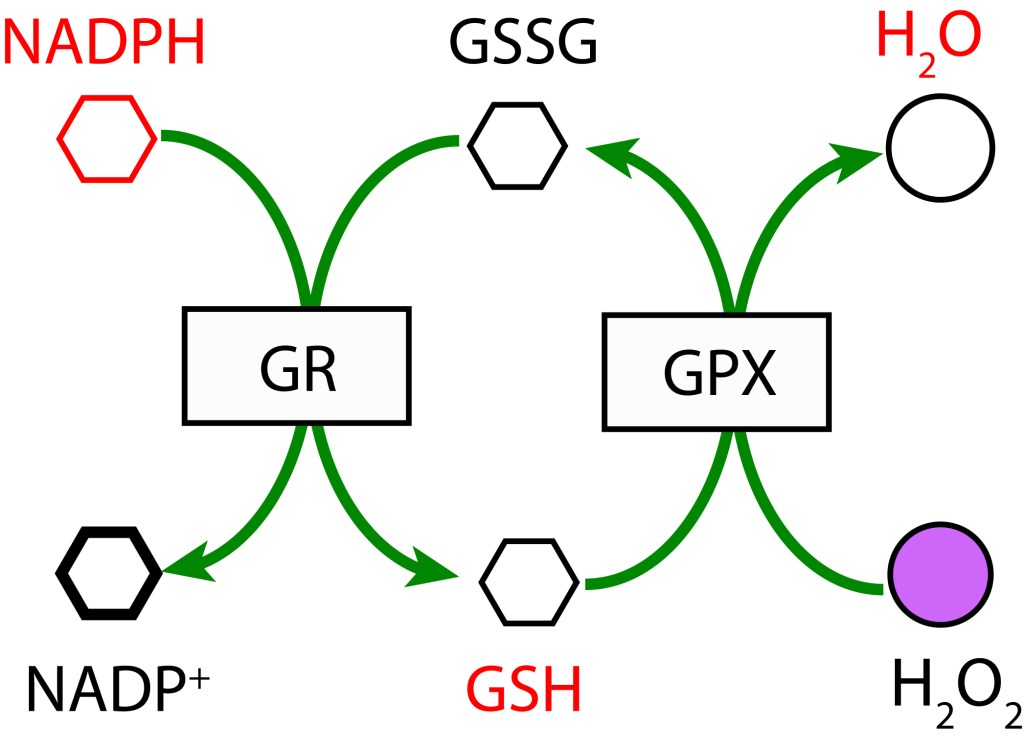 En esta ruta, GSH participa como agente reductor actuando sobre H2O2 para producir H2O mediante la enzima Glutation Peroxidasa (GPX). GSH es regenerado a partir GSSG con NADPH como donor de electrones bajo la acción de la enzima Glutatión Reductasa (GR).