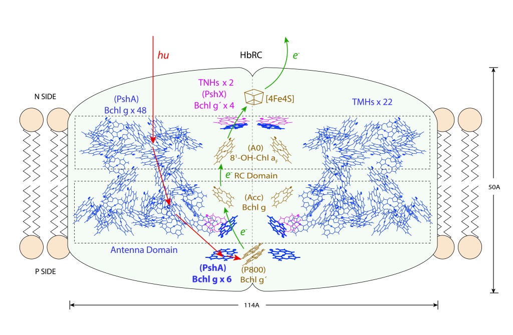 El complejo HbRC corresponde a un homodimero con simetría C2, 24 hélices transmembrana (TMHs) de las cuales 22 están asociadas al homodímero PshA y dos recientemente descritas a una nueva subunidad PshX, ver Fig.1 A. La distribución de pigmentos se describe en la Fig.1 B.