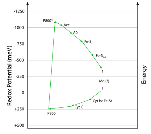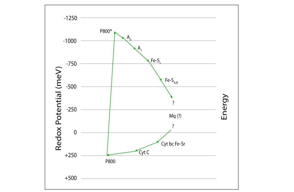 ETC transfiere la energía desde el par BChla exitado hacia FeSA/B, y finalmente a ferrodoxinas Fd citoplasmáticas altamente reductoras, (514-584 mV) , lo que proporciona potenciales suficientes para reducir NADP + vía ferrodoxina/NADP+ oxidoreductasa, lo que habilita las cadenas memtabólicas responsables de la fijación de carbono.