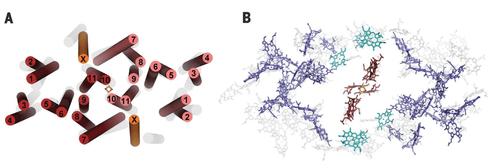 Figura 1. Arreglo de hélices Transmembrana (TMHs y pigmentos) en HbRC. Vista superior. Fuente: Gisriel et.al., 2017. En las imagenes, el autor superpone en gris las hélices (Fig A) y pigmentos (FigB) correspondientes a TMHs de PSI de plantas superiores.