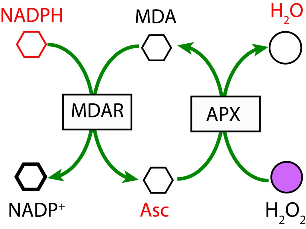 En un primer paso, MDA (Monodeshidroascorbato) se reduce a Ascorbato (ASC) usando NADPH como donante de electrones mediante la enzima MDAR (MDA Reductasa). En la etapa final MDA se regenera mediante la enzima Ascorbato Peroxidasa y transferencia de electrones al Peróxido de Hidrógeno para formar agua.