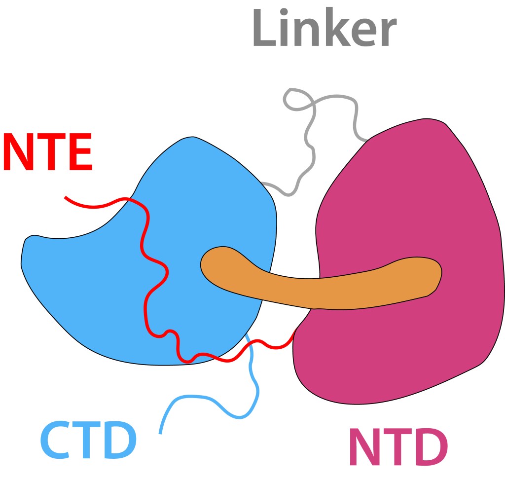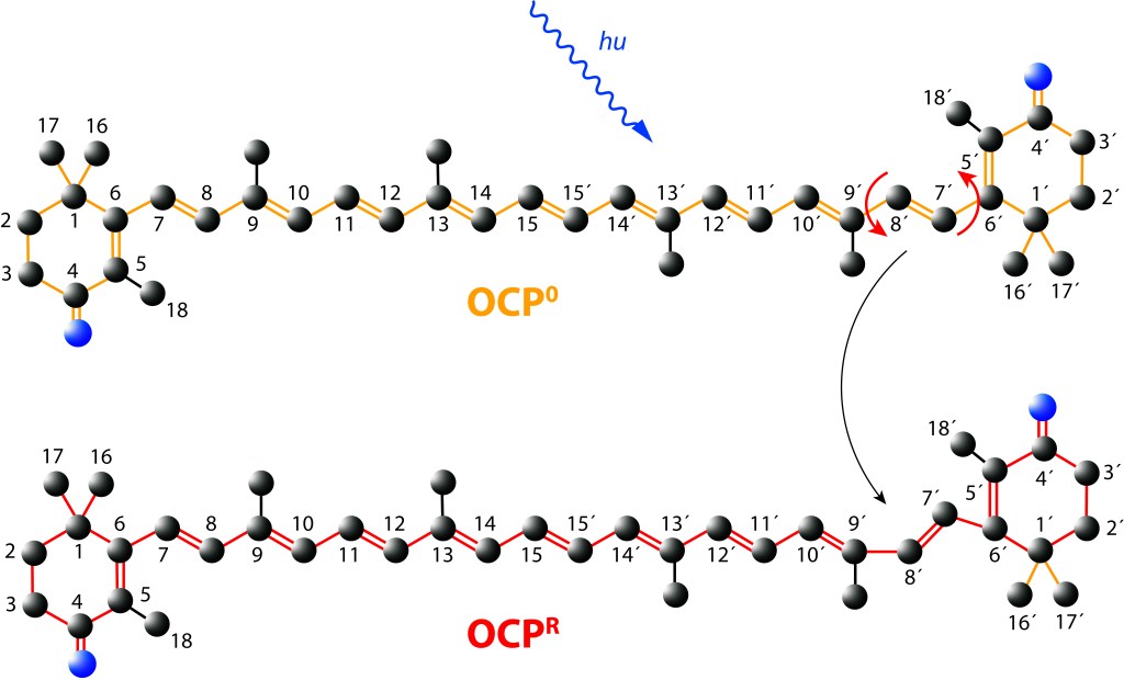 El core del sistema es la “Proteina Carotenoide Naranja”, “OCP”, ver Fig 4, molécula soluble en agua con un peso molecular de 35 kDa, dos dominios, C-Terminal (CTD) y N-terminal (NTD), separados por un linker que actúa a manera de bisagra entre los dominios, una terminal N extendida (NTE) contribuyendo a mantener CTD y NTD adyacentes en estado ground (OCPO) y un cofactor keto-carotenoide (Canthaxanthina).