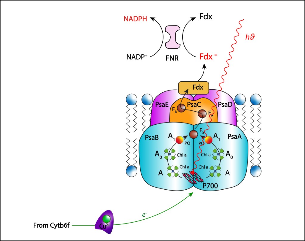 De Fx la energía es transferida hacia dos cluster [4Fe-4S] denominados FA y FB localizados en la subunidad proteínica PsaC, para finalmente reducir una ferredoxina 2Fe-2S Fe-S , denominada Fdx, localizada en el citoplasma.