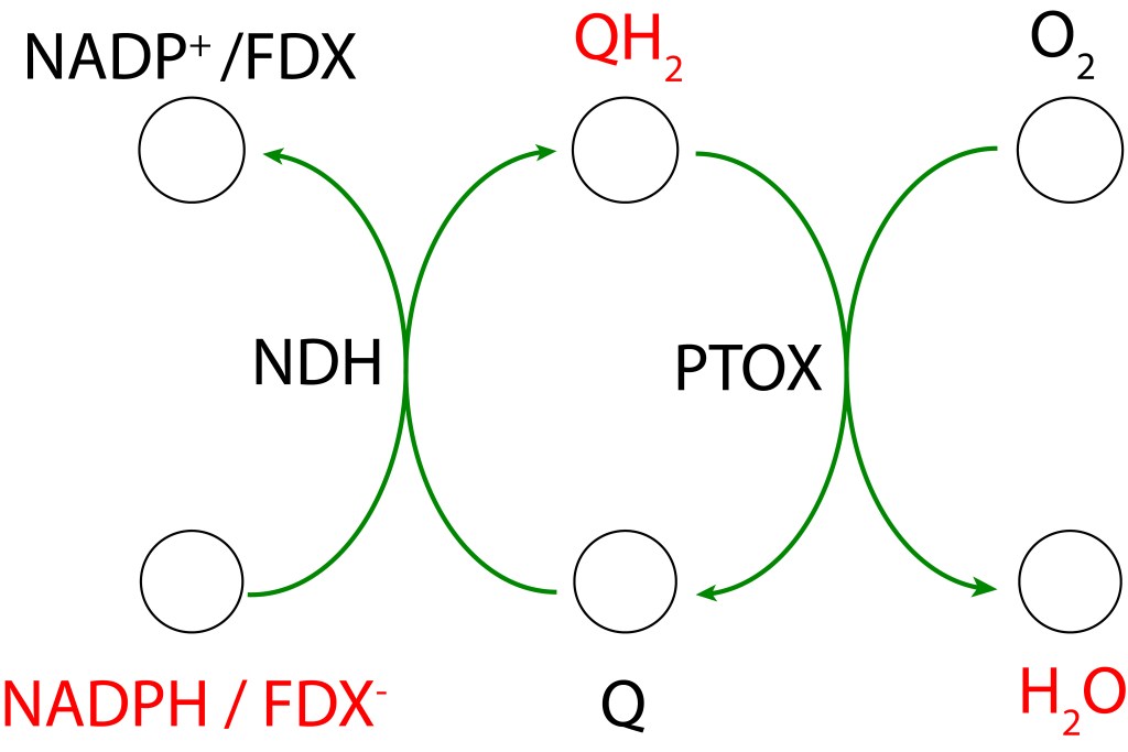 En resumen, NDH-1 y PGRL1 actúan rediraccionando“de manera preventiva” el flujo de electrones de FDX– hacia el pool de quinonas generando un flujo cíclico electrónico no fotoquímico que contribuye a mantener en estado oxidado el entorno PSI , minimizando por esta vía la generación de especies ROS. Ambas rutas habilitan la función de drenaje PTOX, con H2O como depositario final de electrones y oxígeno provenientes del sistema.