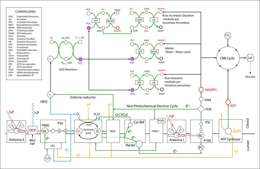 La generación de especies reactivas de oxígeno hace necesario contar con rutas bioquimicas de control que permitan mantener el entorno fotosintético en estado oxidado, ver Fig 3.
