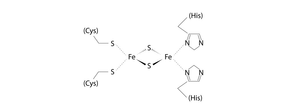 En cuanto a Rieske, el centro [2Fe2S] está coordinado por dos histidinas y dos cisteínas, en lugar de las cuatro Cystinas que caracterizan a la ferredoxina [2Fe2S], ver Fig 11.