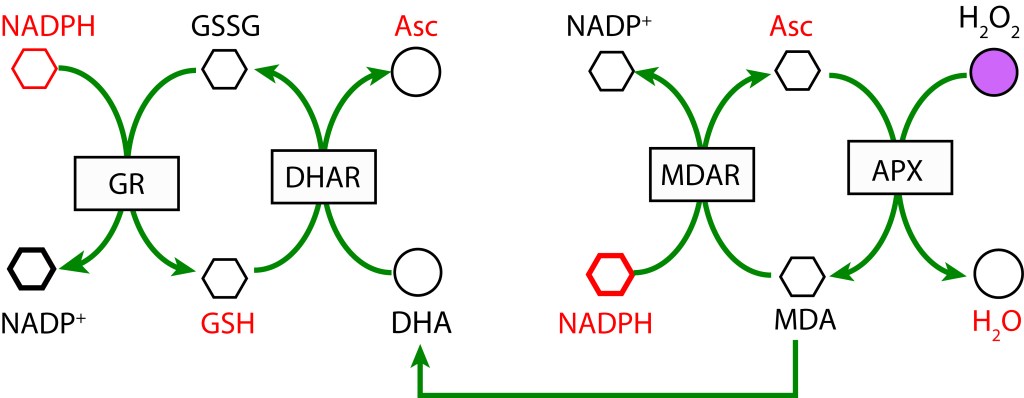 En una segunda cadena de oxidoreducción, Dehidroascorbato se reduce a Ascorbato mediante la enzima Dehidroascorbato reductasa (DHAR), utilizando Glutatión (GDH) como agente reductor, el cual se oxida a su forma Glutatión disulfido (GSSG). Finalmente, GSH se regenera con NADPH como donor de electrones y la acción de la enzima Glutatión reductasa (GR).