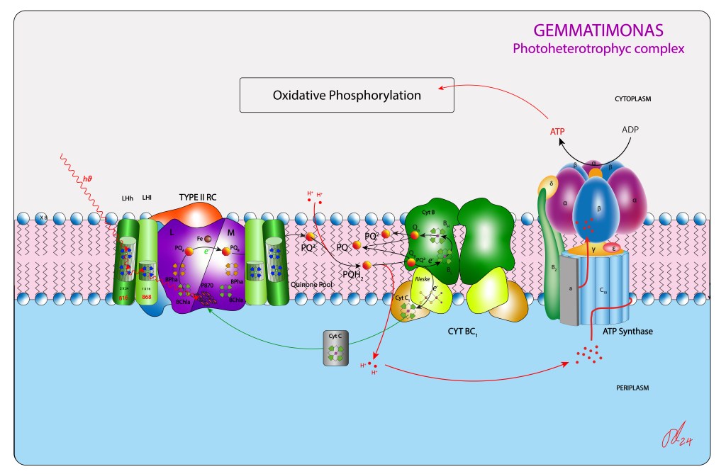 Por otro lado, a pesar de que GSB contiene genes codificantes de Cyt b y Rieske Fe/S (PetB y PetC respectivamente), no ha sido descrito a la fecha genoma codificador de Cyt c1 y Cyt f , de manera que una ruta cíclica equivalente a la vía Cyt bc1 de bacterias púrpura no ha sido demostrada para GSB. El rol de Cyt b y Rieske Fe/S en el complejo es sujeto de investigación.