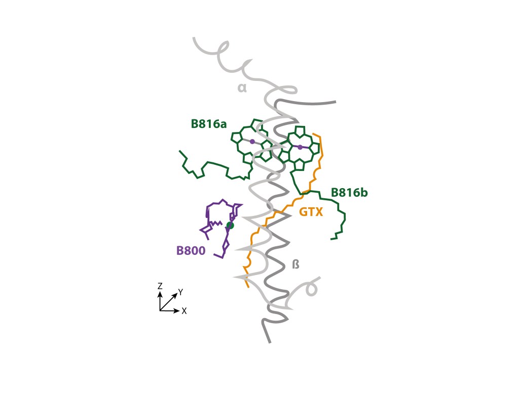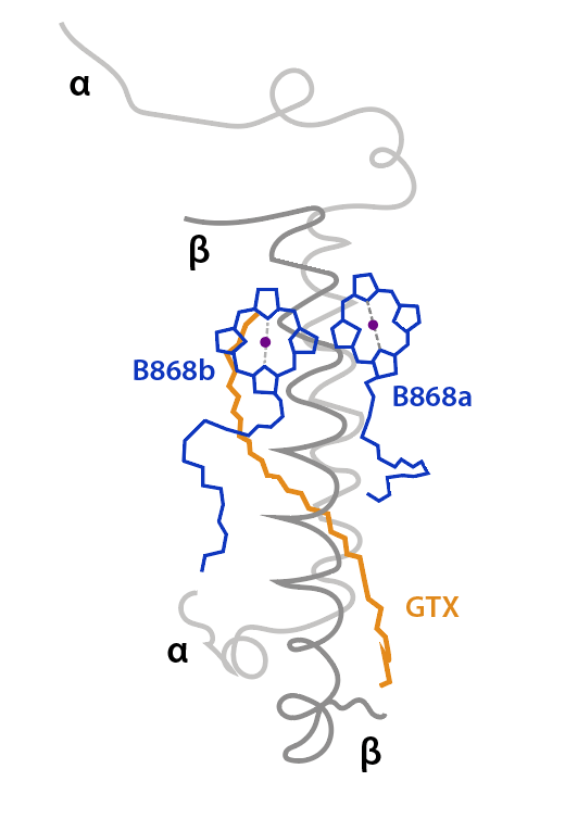 El core del Dominio Antena corresponde a 54 bacterioclorofilas Bchl g (pigmentos de color azul) distribuidas en dos capas, ver Fig 2. De las 54 Bchl g, seis (azul intenso) son proximales al dominio RC, siendo probablemente las unidades responsables de la exitación del par especial de clorofilas.