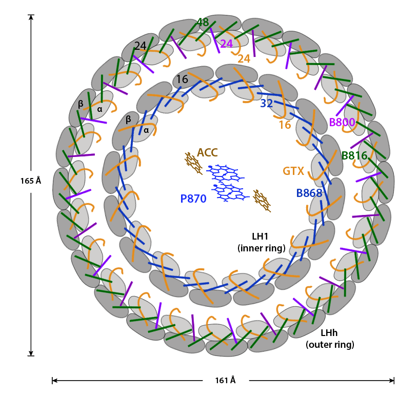 En adición a los pigmentos mencionados, dos moléculas de naturaleza lipídica y dos carotenos 4,4´ Diaponeurosporeno, uno por sumbunidad mioonodimérica, forman parte del Dominio Antena, ver Fig.3.