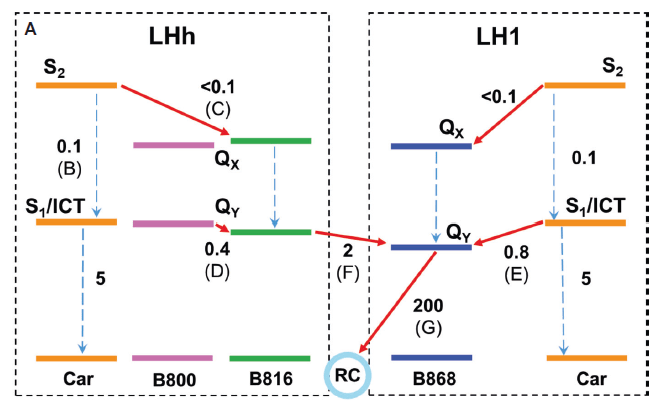 Para activar la cadena de transporte de electrones, RC contiene como cofactor prostético un par de bacterioclorofilas BChla exitable a 840 nm, que les permite pasar de un estado GND un estado exitado P840*, ver Fig. 1.