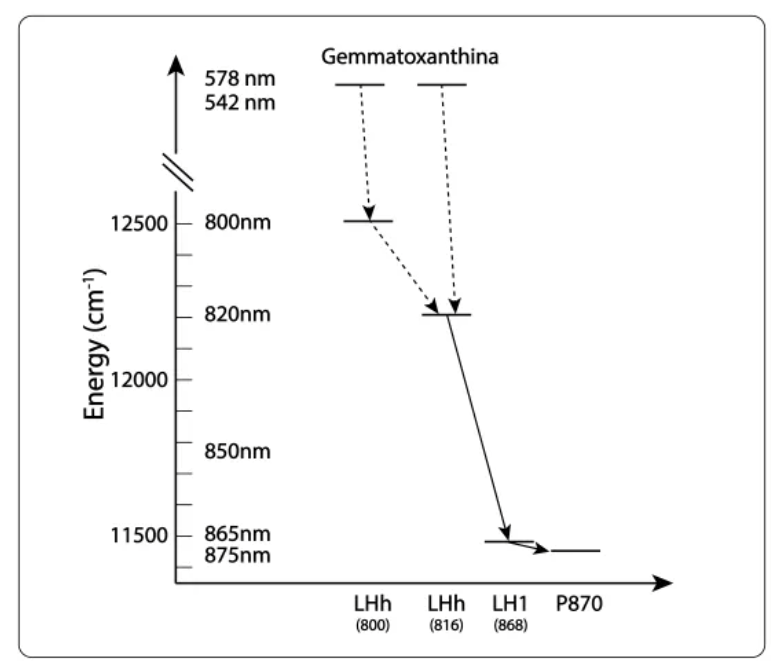 La Fig 4 representa la transferencia de energía entre y dentro de los dos anillos LH1 y LHh. Aunque no está referenciado en la literatura, las transferencias electrónicas deben obedecer a resonancia no radiativa de Förster.