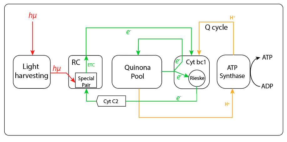 El tránsito de electrones a lo largo del proceso, al igual que en los complejos fotosintéticos presentes en los demás grupos bacterianos y en la maquinaria de foforilación oxidativa mitocondrial, permite generar un gradiente protónico intermembrana (PMF) indispensable para la síntesis de ATP.