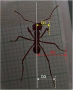 Fotografía 3. Apertura D de cada par de patas. Nótese la apertura extendida del par central comparada lon la de los otros dos pares. Esto garantiza un triángulo de apoyo extendido, muy estable durante la marcha. Puesto que en Atta las inserciones coxales son ventrales, muy cercanas al eje corporal, ver Fig. 13, , los valores de D se pueden calcular desde el mismo eje. Valores medidos: D1: 3 mm, D2: 7 mm, D3: 4 mm para una longitu corporal de 9 mm.