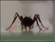 Fotografía 2. TILT_0 Del par central. Nótese también el apoyo “en punta de pié”, en busca de agarre por los espolones o espuelas tibiales insertadas en el ultimo segmento Tasrsal. Esta posición se dá en superficies de difícil agarre y que no requieren maximizar la superficie de apoyo, en comparación de superficies blandas (gravas, lodos), donde el apoyo se dá sobre los cuatro ultimo segmentos tarsales.