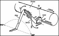 - ETAPA DE EMPUJE (En Ingles Stance o Power Stroke). Durante toda la etapa el punto de apoyo está en en contacto con el piso aplicando una fuerza opuesta a la dirección de avance del individuo. La trayectoria del punto de apoyo (Tarso) relativa al cuerpo vista es y lineal , desde AEP a PEP, paralela al eje de movimiento corporal, lo cual es logrado con una combinación única de valores de ángulos β y γ para cada valor de avance α definido por el par muscular protactor-Retractor. En la trayectoria lineal, paralela al eje corporal, la fuerza aplicada para el avance corporal es aprovechada en su totalidad, en oposición a una trayectoria circular, correspondiente a modelos robóticos de 12 grados de libertad (articulaciones Torax-Coxa y Coxa-Trocanter dinámicas, con articulación Femur-Tibia estática), en las cuales la fuerza es aplicada tangencialmente al semicírculo de recorido, con solo su componente vectorial de fuerza paralelo al eje corporal Fy aprovechable, ver Fig.2. .