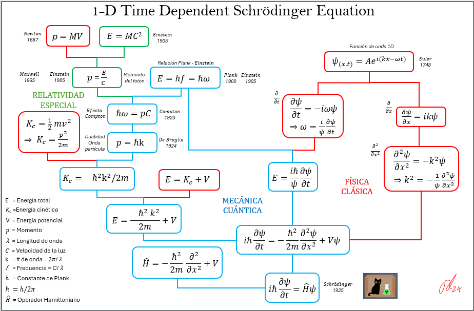El desarrollo matemático que encabeza este blog es una invitación a abordar esta nueva física. M intención al escribir este blog es presentar de una manera sencilla el desarrollo de la función, resaltando en colores los aportes que para llegar a la misma tuvieron la relatividad especial, la mecánica cuántica y la física clasica.