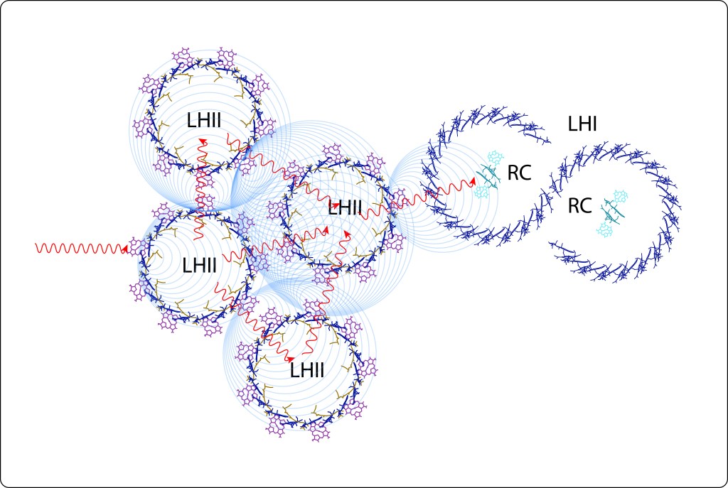 Mediante resonancia no radiativa (Resonancia de Förster) y coherencia cuántica, la energía capturada en LHII es transferida a LHI, para finalmente ser transladada a un par especial de bacterioclorofilas, denominadas Special Pair, localizadas en el Centro de Reacción, RC, ver Fig 7.
