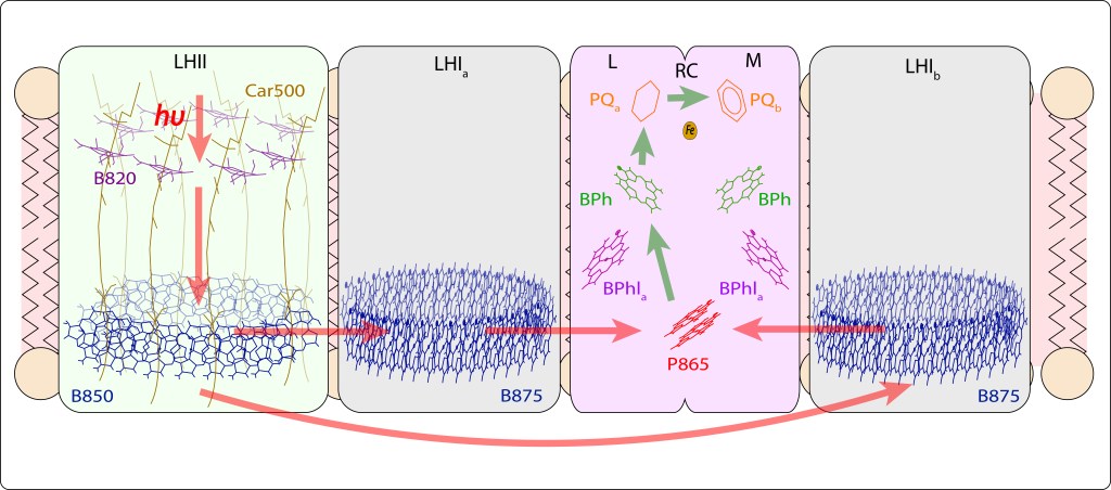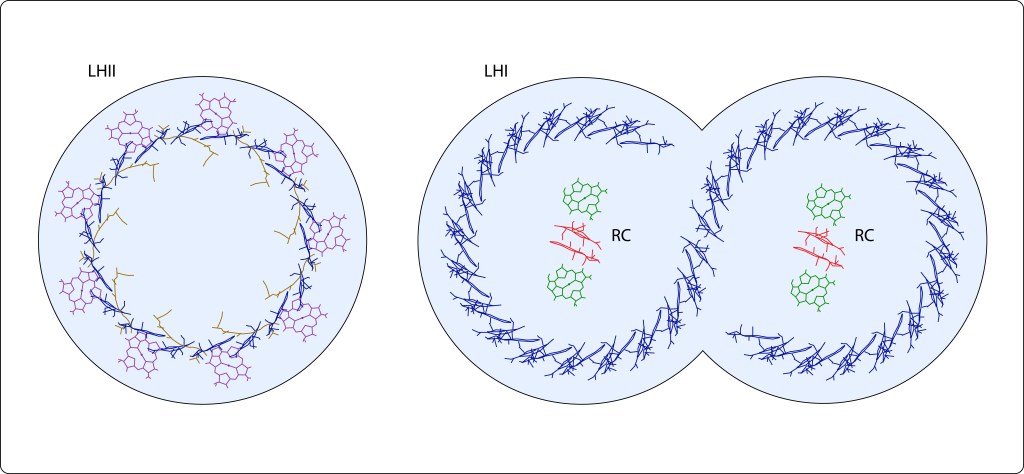 En bacterias púrpura, la energía lumínica exita pigmentos fotosintéticos, carotenos y clorofilas, geométricamente distribuídos al interior de dos tipos de complejos proteicos transmembrana denominados complejos antena LHII y LHI, ver Fig 6.