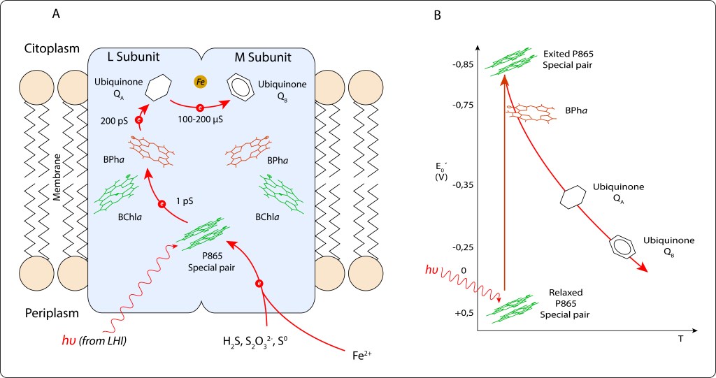 Fig 11. Cadena de transporte de electrones en RC. A. Pigmentos y moléculas involucradas en el transporte. B. Niveles de energía correspondientes a cada etapa.