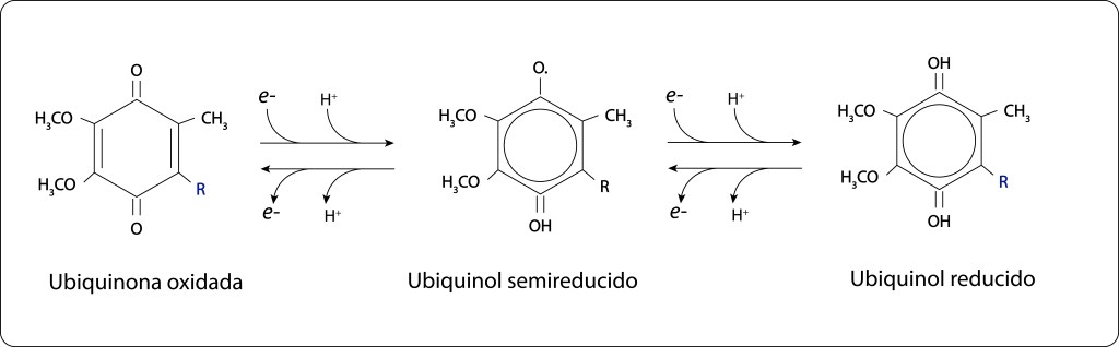 Fig 12. Reducción de Ubiquinona a Ubiquinol, pasando por Ubiquinol semireducido.