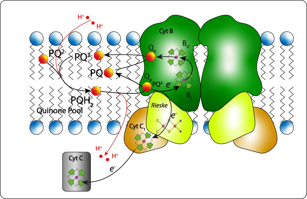 El complejo citocromo bc1 , al igual que b6f en cianobaterias y en mitocondrias de células eucariotas, se caracteriza por contener moléculas Heme como cofactores responsables del transporte de electrones.