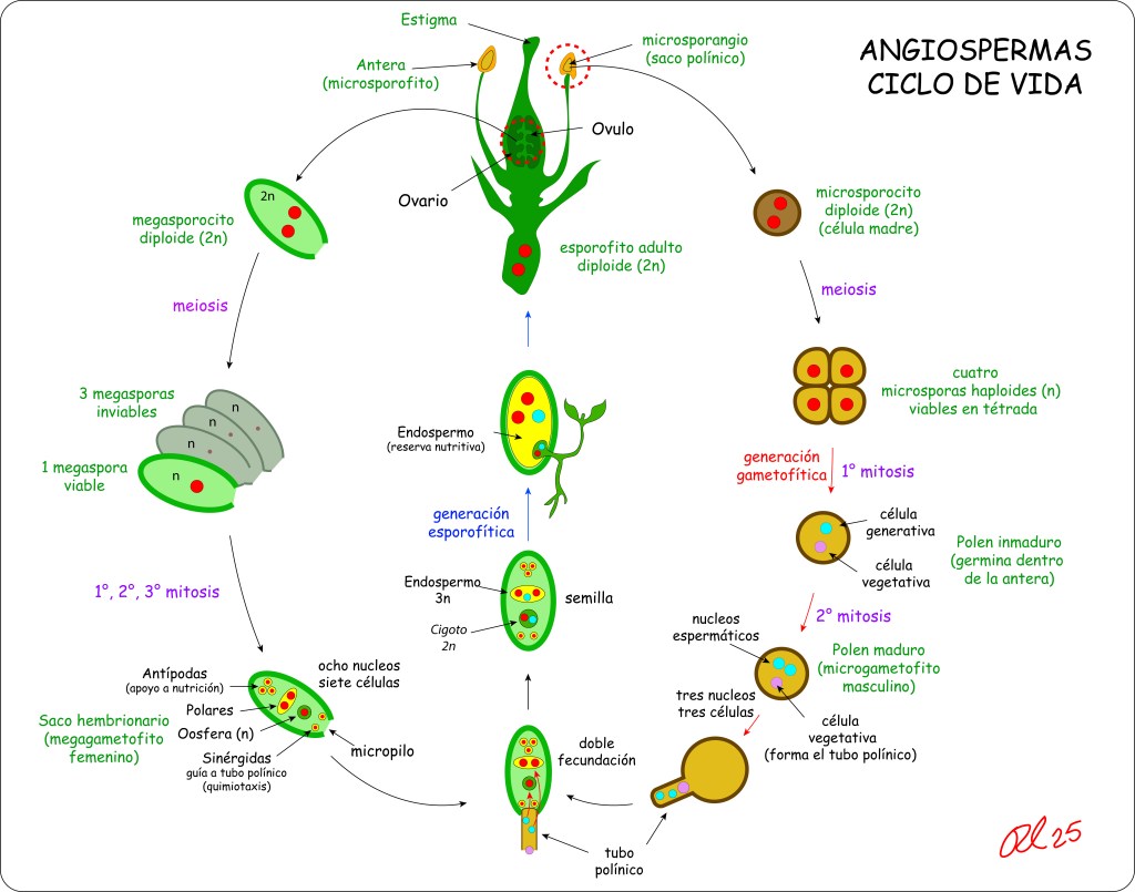Aunque está suficientemente documentado el ciclo de vida de las Angiospermas, no es fácil encontrar diagramas lo suficientemente claros y autocontenidos, de manera que incluyo uno que espero cumpla las condiciones mencionadas.
