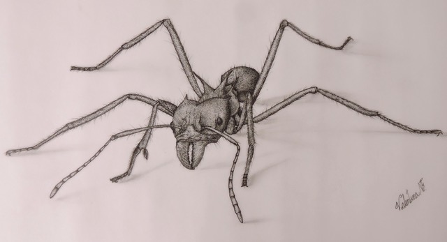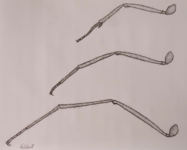 Fotografía 3. Apertura D de cada par de patas. Nótese la apertura extendida del par central comparada lon la de los otros dos pares. Esto garantiza un triángulo de apoyo extendido, muy estable durante la marcha. Puesto que en Atta las inserciones coxales son ventrales, muy cercanas al eje corporal, ver Fig. 13, , los valores de D se pueden calcular desde el mismo eje. Valores medidos: D1: 3 mm, D2: 7 mm, D3: 4 mm para una longitu corporal de 9 mm.