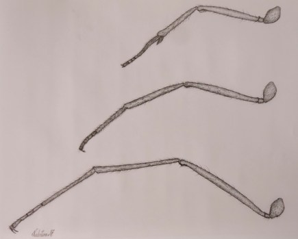 Fotografía 2. TILT_0 Del par central. Nótese también el apoyo “en punta de pié”, en busca de agarre por los espolones o espuelas tibiales insertadas en el ultimo segmento Tasrsal. Esta posición se dá en superficies de difícil agarre y que no requieren maximizar la superficie de apoyo, en comparación de superficies blandas (gravas, lodos), donde el apoyo se dá sobre los cuatro ultimo segmentos tarsales.