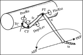 Puesto que los músculos Protactor y Retractor que controlan la articulación Torax-Coxa, generan un ángulo de Paneo (PAN), mientras que los músculos Elevador y Depresor que controlan la articulación CT (misma Figura) generan un ángulo de elevación TILT del Fémur, la evolución de estos dos ángulos a lo largo del tiempo definen la posición espacial (x, y, z) del extremo distal del femur, el cual se combina con la evolucion de los valores del ángulo Femur-Tibial para definir la evolución espacio-temporal del punto de apoyo.