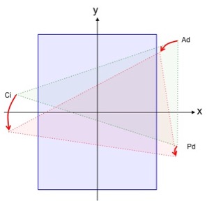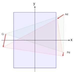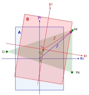 Si proyectamos la superficie corporal de la hormiga sobre un plano cartesiano con su centro corporal en el punto (0,0) , ver figura 1, y consideramos el plano A (plano azul, como el plano de la posición inicial de marcha, con coordenadas (X0,Y0) correspondientes al centro corporal del hexápodo, despues de un tiempo t la marcha generará un segundo plano B (plano rojo), de manera que las coordenadas del centro corporal corresponderán a las coordenadas (X1,Y1)), con una translación del origen (0,0) (vector O(A_B)), y una rotación del plano cartesiano un ángulo PHI (si hay un giro involucrado), o sin rotación (PHI =0) (si se trata de marcha frontal). Puesto que en estas consideraciones básicas lo que varía es la posición corporal, el triángulo de empuje (en este caso el triángulo Ad-Ci-Pd ) permanecerá invariante, esto es, fijo al suelo ejecutando la función de empuje, de manera que los puntos de inicio de empuje corresponderán a las coordenadas de los puntos de apoyo sobre el plano A , vector PA en la figura 20, y los puntos de apoyo de fin de empuje corresponderán a las proyecciones de los mismos puntos sobre el plano B ,Vector PB misma figura.